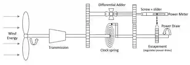 1 )AREE将风力储存在表簧中,就像一块怀表。下图所示系统可以用加法器来计算弹簧中储存的能量;