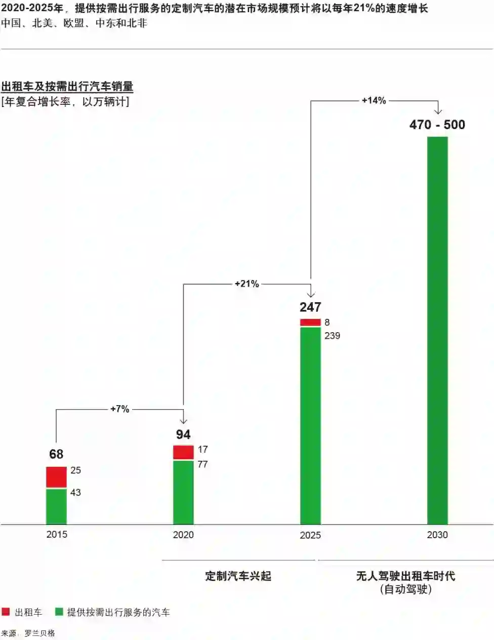 罗兰贝格最近发布的报告预计,到2020 年,用于新型出行服务的车辆将占总新车销售的13%,一个新的细分市场即将出现,即提供按需出行服务的新一代定制汽车。欧洲、美国和中国的定制网约车和出租车的年销量到2020年预计可达到100万辆,到2025年将增至250万辆。