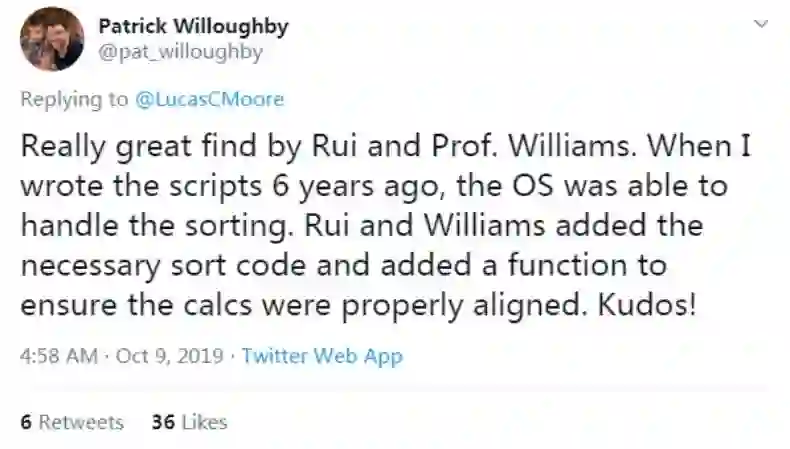 他说,「Rui 和 Williams 教授的发现真的非常棒。6 年前我写这个脚本的时候,操作系统能够处理排序问题。Rui 和 Williams 添加了必要的排序代码和函数来确保计算排序一致,给他们点赞!」