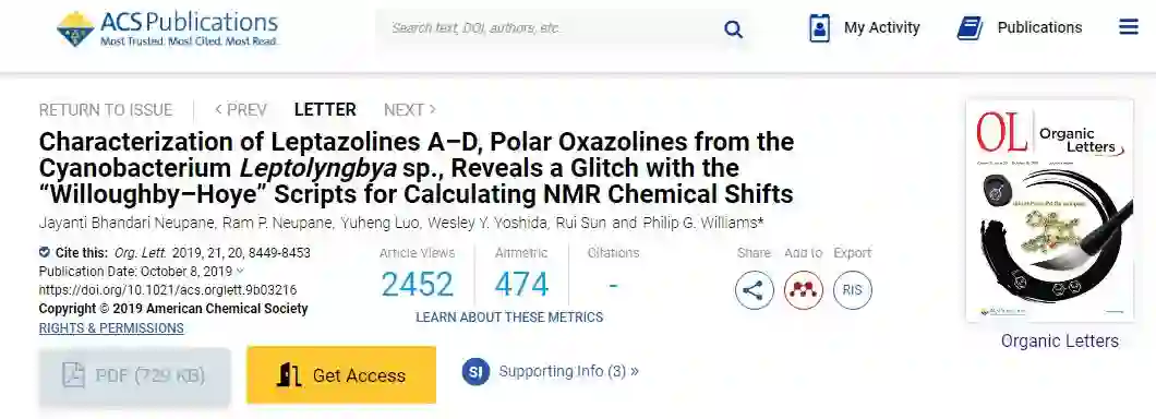 2014 年,《Nature》子刊上发布了一篇名为《A guide to small-molecule structure assignment through computation of (1H and 13C) NMR chemical shifts》的化学论文,论文中包含了上文中提到的使用 Python 语言构建的脚本。