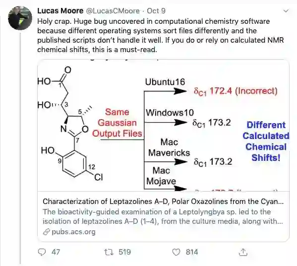论文中提到的脚本名为「Willoughby-Hoye」,用来计算核磁共振图谱的化学位移值。夏威夷大学的研究者发现,在该脚本中,有一个模块是根据文件的排序返回值,但 Python 并没有定义查询的文件顺序。因此,该系统在不同的脚本上会有不同的返回值。