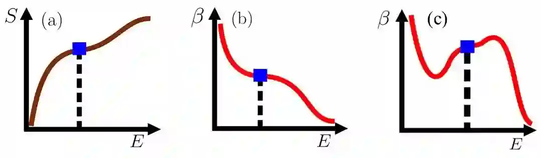 图6. (a) 一级伪相变发生时,系统的微正则熵随能量变化的曲线。其中,微正则熵会在相变处发生凹陷。图中的切线为吉布斯规则 (Gibbs construction) 所定,它被用来确定伪相变的相变区间。(b) 微正则熵的一阶导数β随能量变化的曲线。一级伪相变发生时,β会发生回弯。图中的水平线为麦克斯韦规则 (Maxwell construction) 所确定,它被用来确定伪相变的温度。