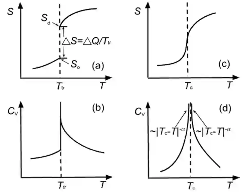 图3. (a) 一级相变发生时熵随温度的变化曲线。其中,Sd 以及So 分别代表系统在无序和有序相时的熵,Ttr 代表相变温度,ΔQ 为相变潜热。一级相变时,系统的熵不连续。(b) 一级相变发生时比热容随温度的变化曲线。在一级相变中,系统的比热容不连续。(c) 二级相变发生时熵随温度的变化曲线。在二级相变中,系统的熵连续。(d) 二级相变中比热容随温度的变化曲线。二级相变发生时,系统的比热容发散,系统接近临界温度Tc 时的比热容可以用幂律关系来描述,对应的临界指数为α。