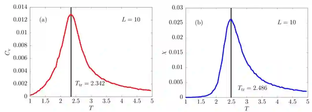 图5. 通过蒙特卡洛模拟,测得 10 × 10 方形晶格伊辛模型的 (a) 比热容、(b) 磁化率。由此估算出伪相变温度分别为 2.342 和 2.486。
