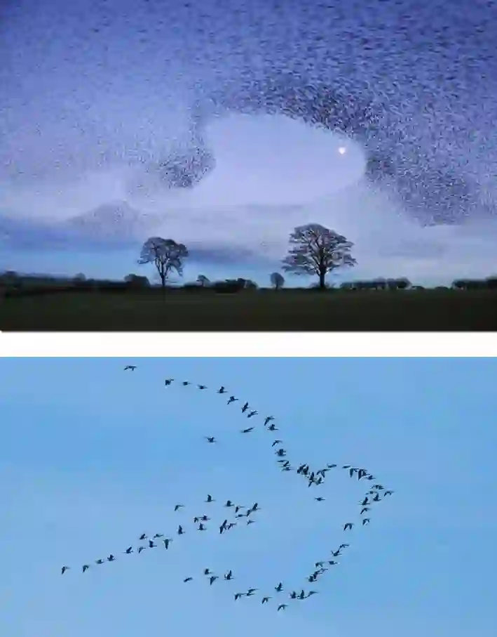 图1. 飞鸟成群的形态实例:上图所示为混沌形态,下图所示为简单结构。