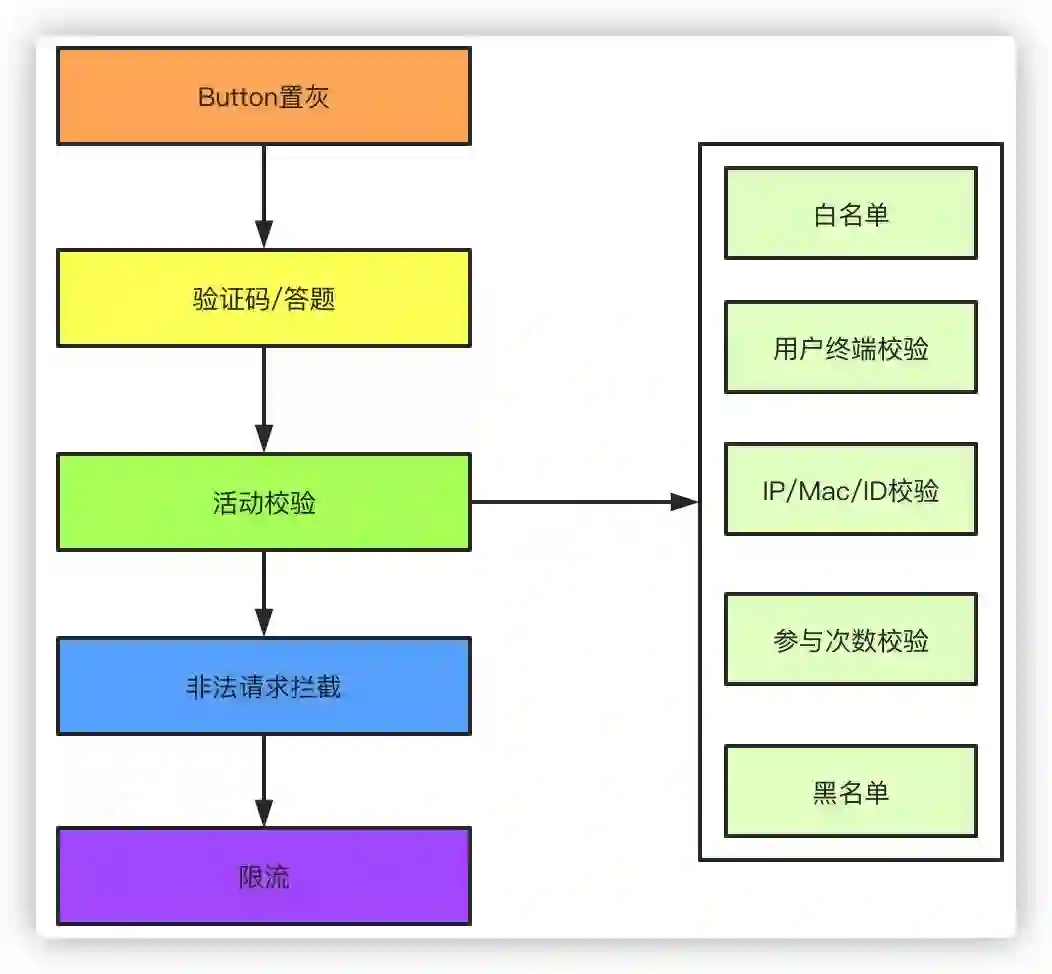 活动校验,既然是活动,那么活动的参与用户,参加条件,用户白名单之类的要首先做一层校验拦截,还有其他的比如用户终端、IP地址、参与活动次数、黑名单用户的校验。比如活动主要针对APP端的用户校验,那么根据参数其他端的用户将被拦截,针对IP、mac地址、设备ID和用户ID可以对用户参与活动的次数做校验,黑名单根据平时的活动经验拦截掉一部分羊毛党等异常用户。