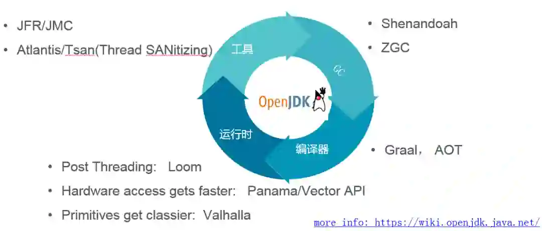 如果从 JVM 视角来总结梳理下目前 OpenJDK 社区正在发生,孵化的相关技术,主要从工具,GC,编译器,以及 Runtime 四个方面进行一个主要概括: