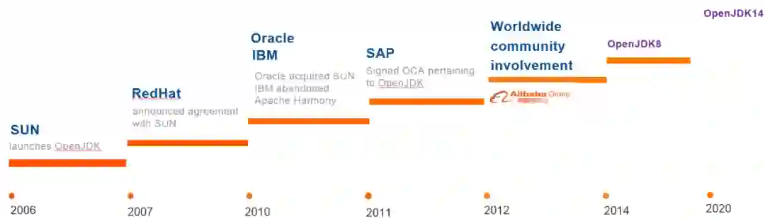 Sun 在 2006 年的 Java One 大会上,宣布 Java 技术开源,随后 2006 年底在 GPL 协议下发布 HotSpot 以及 javac,这是 Java 发展中的里程碑事件。阿里巴巴最早在 2012 签署 OCA,并参与到了 OpenJDK 的开发。