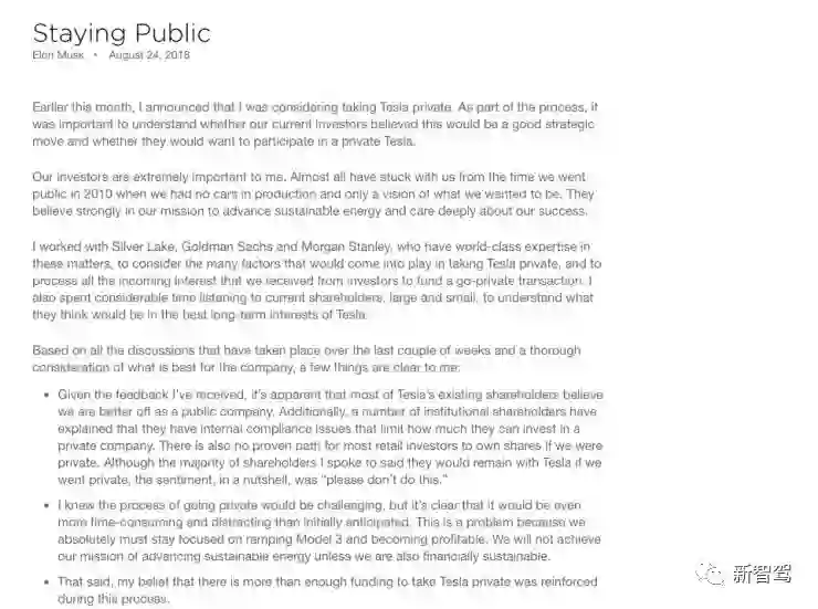 在宣布“考虑特斯拉私有化”的18天时间后,马斯克今天亲自发公开信表示:放弃私有化。在今天的公开信当中,马斯克也表示大多数的股东认为特斯拉作为上市公司将会更加好。此外,马斯克也坦诚承认私有化的过程非常具有挑战性,比最初预想的更耗费时间和精力。