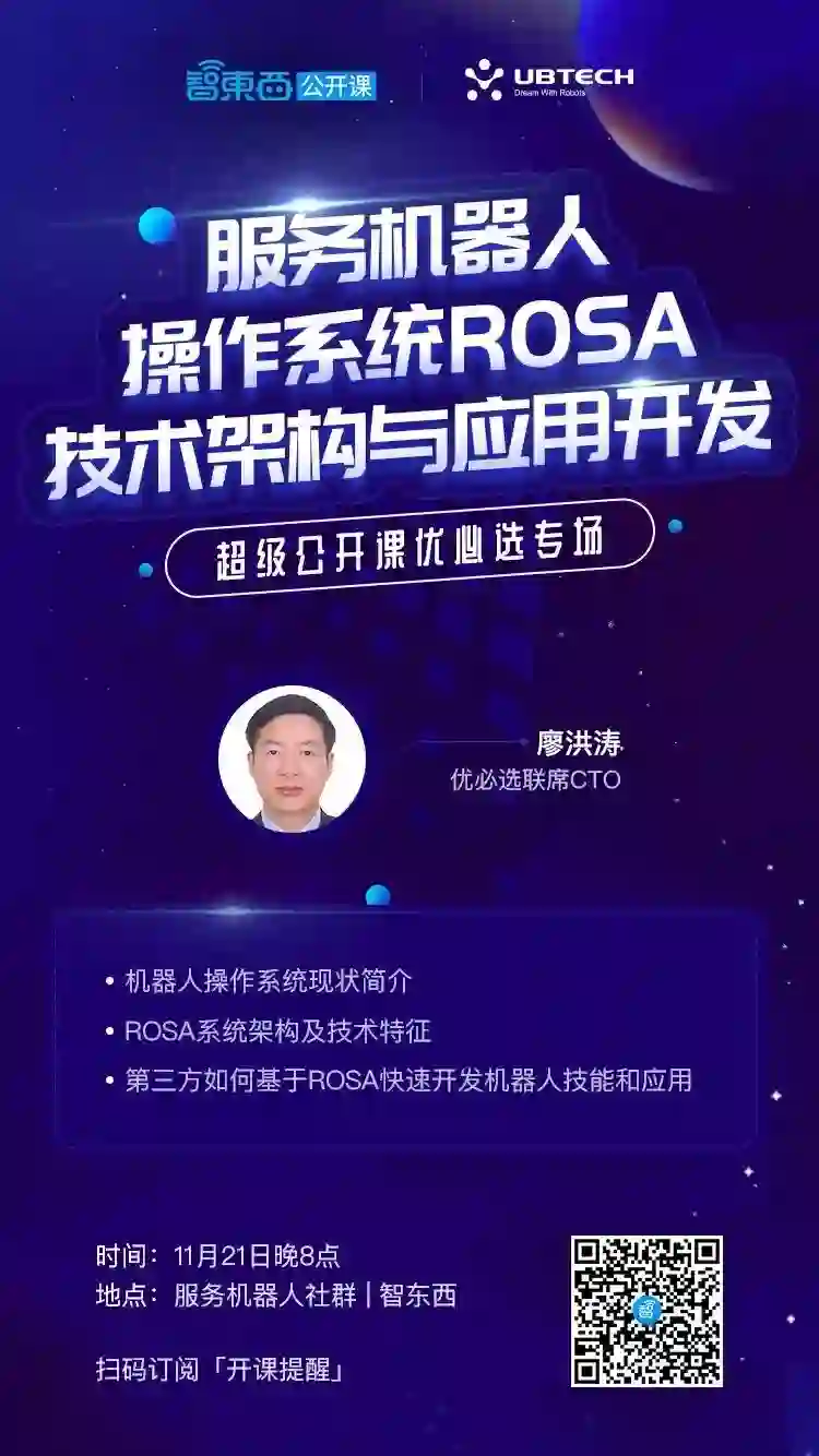 11月21日(周三)晚8点,超级公开课优必选专场将开讲,主题为《服务机器人操作系统ROSA技术架构与应用开发》,由优必选联席CTO廖洪涛博士主讲。他将在智东西「机器人」社群以及「智东西公开课」小程序进行主讲和互动。