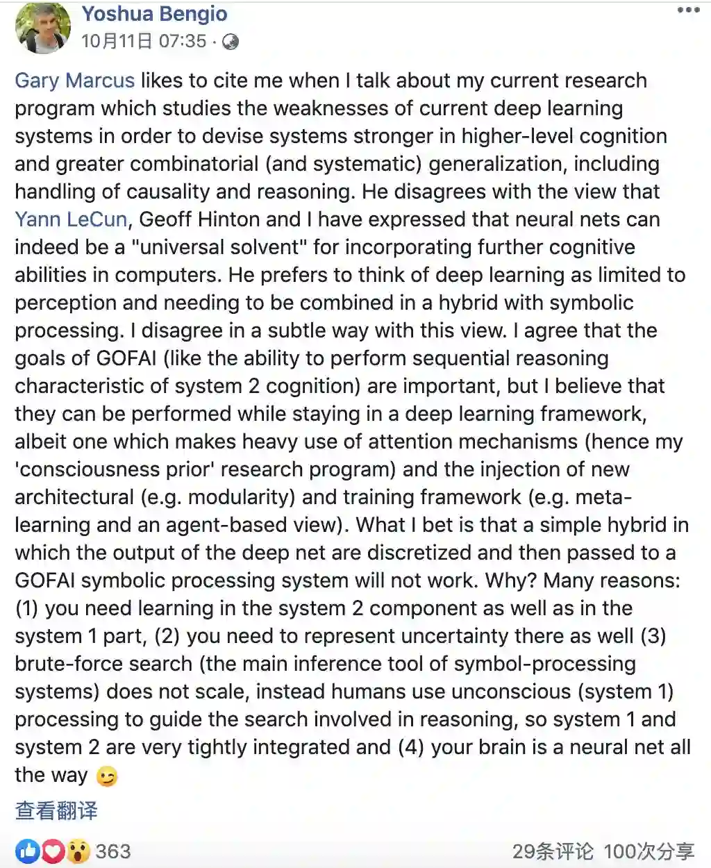 10 月 11日,Yoshua Bengio 在 Facebook 予以回应,两人就 AI 和深度学习的发展现状进行了一来一回的“互怼”。