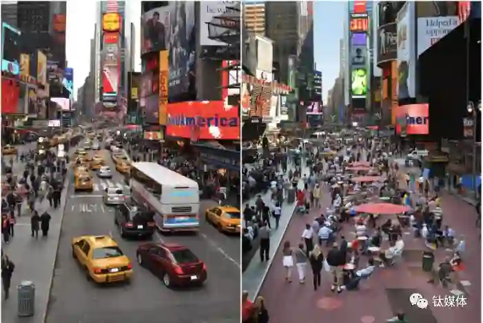 纽约时代广场改造前(左)后(右)