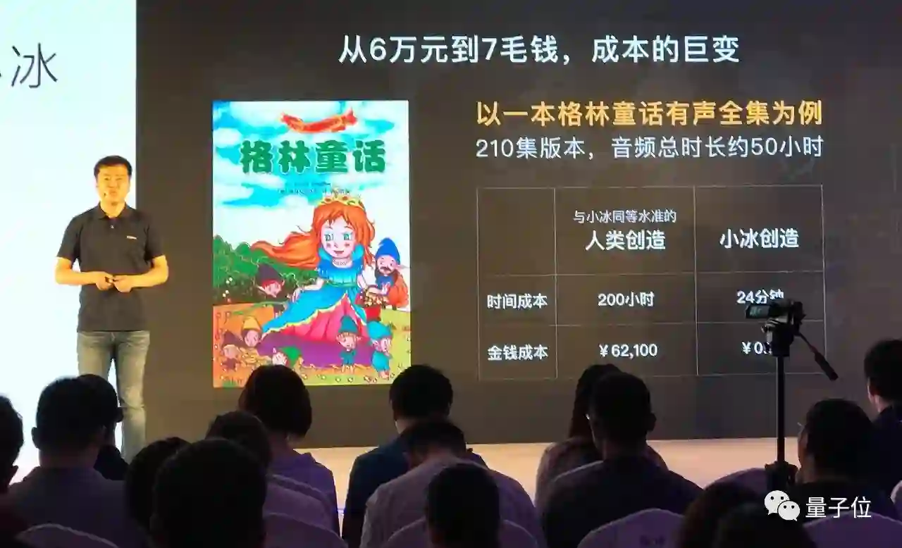 以《格林童话》为例,如果人类选手生成一版50小时长的《格林童话》有声读物,需要耗时至少200小时,金钱成本62100元,但如果让小冰来做,可能只需要24分钟,花费7毛钱。