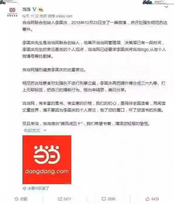 昨天12月23日,李国庆发了一篇微博,点评刘强东明尼苏达事件,这个微博引发了轰动。当时就有很多网友马上宣称要抵制当当网了。