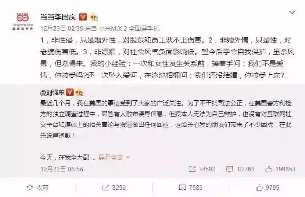 刘强东就不必说了。虽然美国警方“不起诉”,但他也承认事情是真的,只不过他认为是双方自愿,对方认为是强迫的。即使越过受害人的问题,此举,置此前天天晒恩爱的妻子于何地?