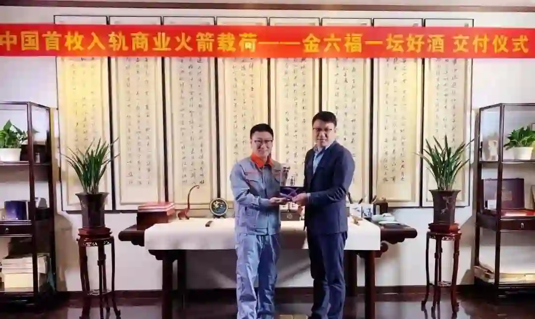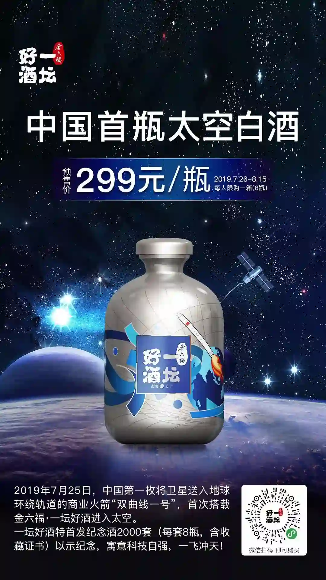 事实上,最直观的商业化尝试无疑消费品搭载火箭升空。而在此次正式发射的火箭舱内,不仅携带了4颗卫星,还为太空带去了一份特殊的礼物——金六福一坛好酒,首次尝试将消费品——一整瓶中国白酒送入太空。