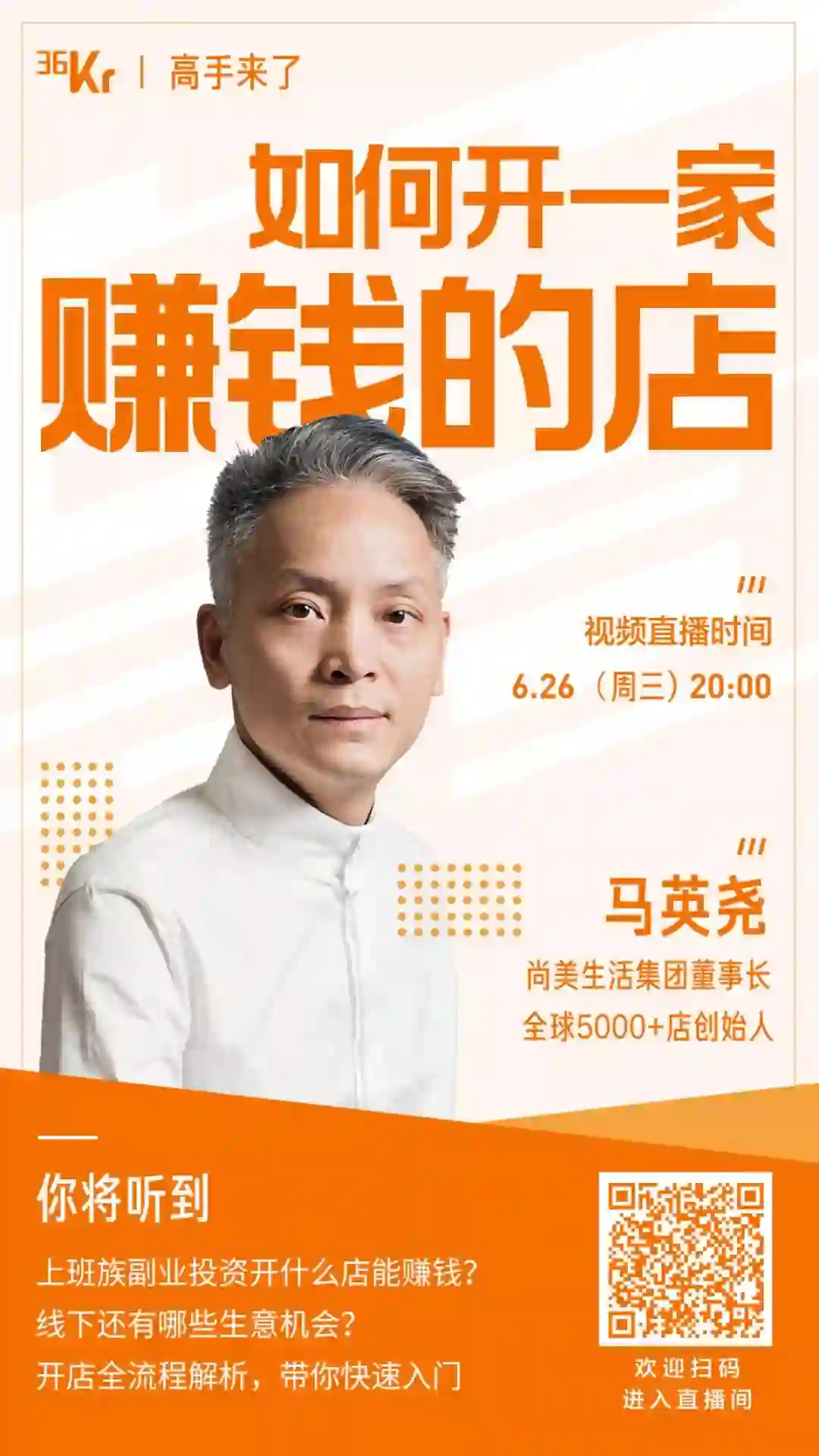 除了系统课程,开氪还邀请了老马进行一次线上免费直播,这也是老马面向C端的首次真人视频直播,分享如何开一家赚钱的店。就在本周三(6月26日)20:00~21:00 。