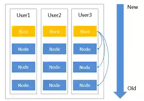 怎样来管理一个不断增长的数据,同时保证数据的访问维持在一个相对固定的深度?首先我们再来看看用户数据的特点,按时间数据写入。访问主要是近期的数据,越老的数据访问频率越低。因此,我们将根节点的分档数据按照一个链的方式串起来,最新的在链头,最老的在链尾。当用户访问新的数据时,平均只需要2次查询(根节点+数据节点),访问较老数据时需要遍历根节点的链,由于这个链是有序的,所以可以采用二分查找,时间复杂度为O(logn)。