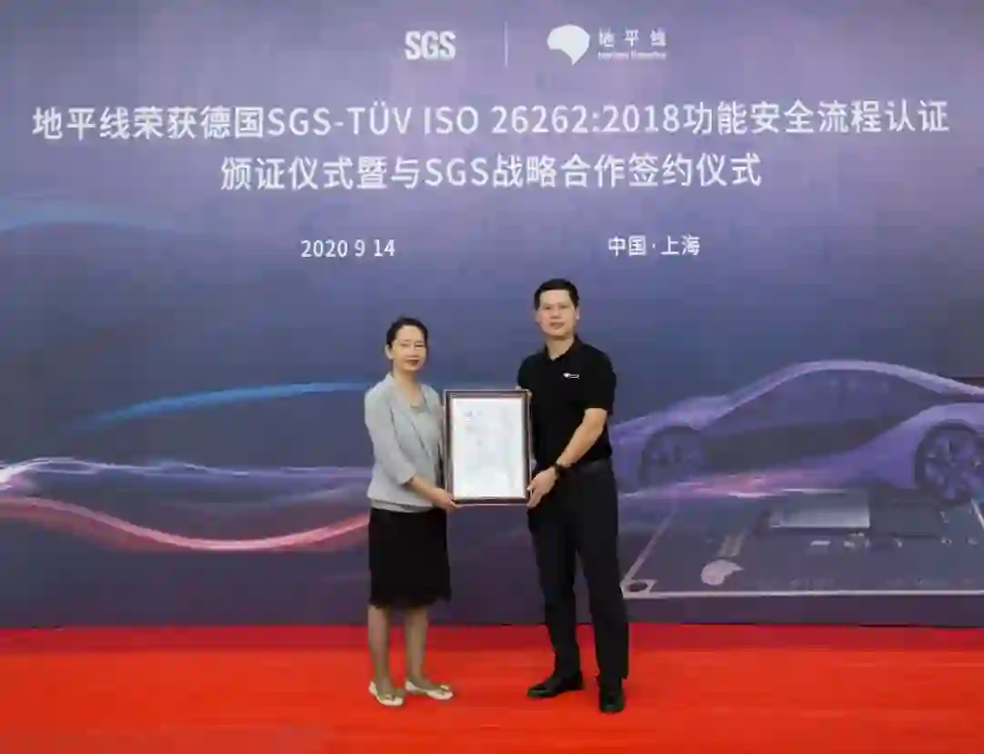 9 月 14 日,全球知名的检验、鉴定、测试和认证机构 SGS TÜV Saar(全球功能安全技术中心)于上海向地平线颁发了 ISO 26262:2018 功能安全流程认证证书。
