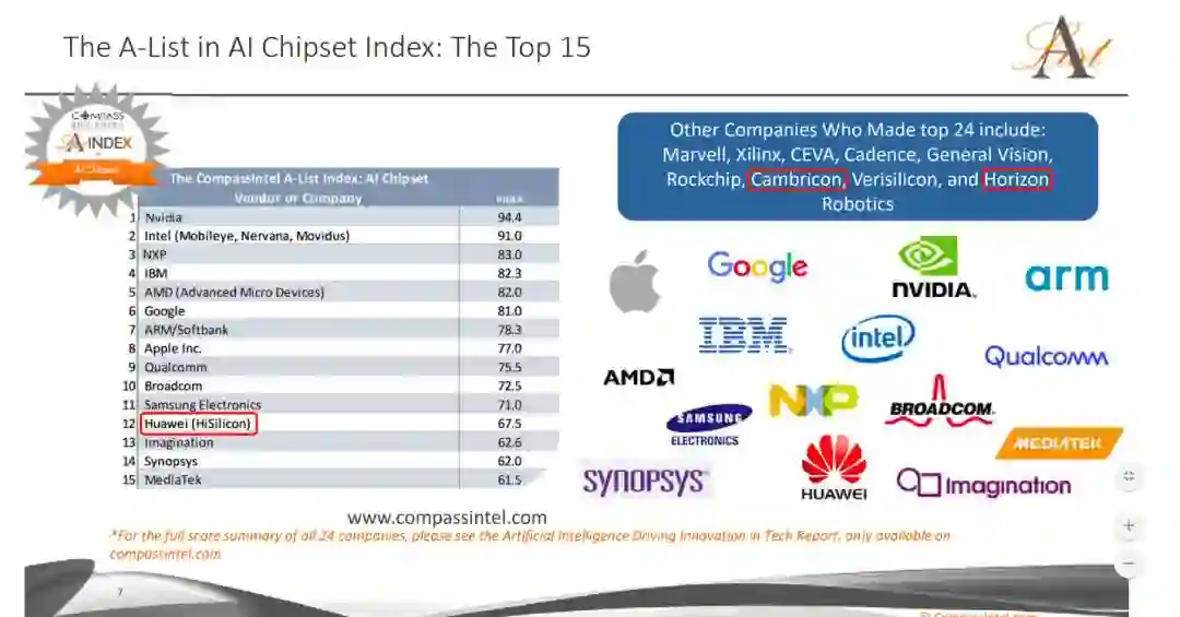 根据上述指标,Compass Intelligence给出的AI芯片公司排名(前15名)如下图: