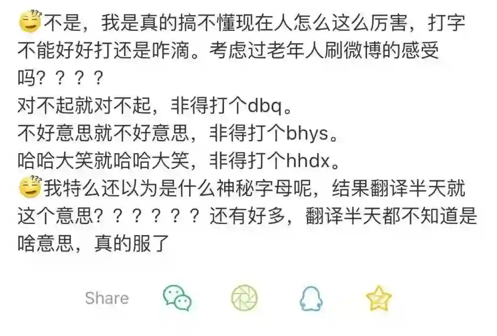 而这些赞同的网友或许就是博主口中的“老年人”了,毕竟那些已经习惯“缩写体”的新一代网络原住民,可丝毫没有阅读障碍。有些被问得不厌其烦的00后还专门开帖总结出60个缩写词汇的原意,供我们这些“老人家”对照学习。