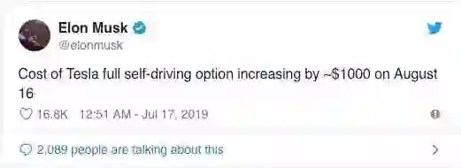 特斯拉CEO埃隆·马斯克(Elon Musk)称,从8月16日起,“全自动驾驶版”Autopilot系统的售价将上调大约1000美元。目前,如果消费者在买车时一同购买这种更高级别的升级包,它的售价为6000美元。不过,如果消费者在提车后再决定升级,它的售价达到8000美元。目前还不清楚马斯克是否指的是提高这两种升级选项的价格。