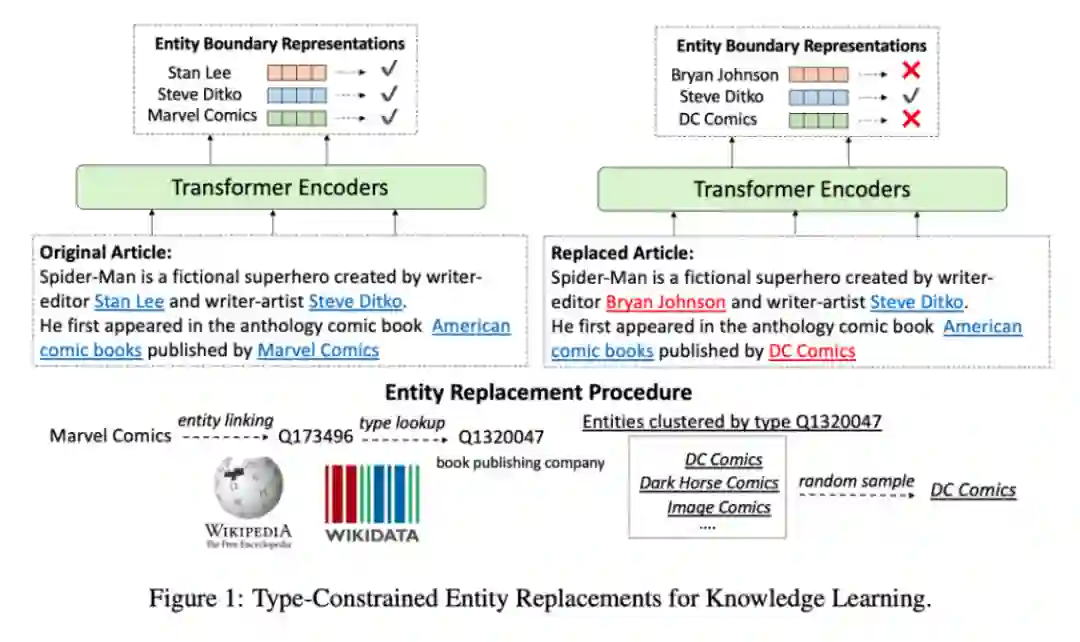 这篇文章用更结构化的数据:维基百科和它其中实体来研究自监督训练的能力,而不是应用普通的MLM模型。他们用其他相似类型的实体(如ELECTRA)替换了文本中的实体,模型学习通过上下文来识别这种被替换的句子。通过这种方法,模型被强制学习了现实世界实体的信息,以及它们之间的关系。