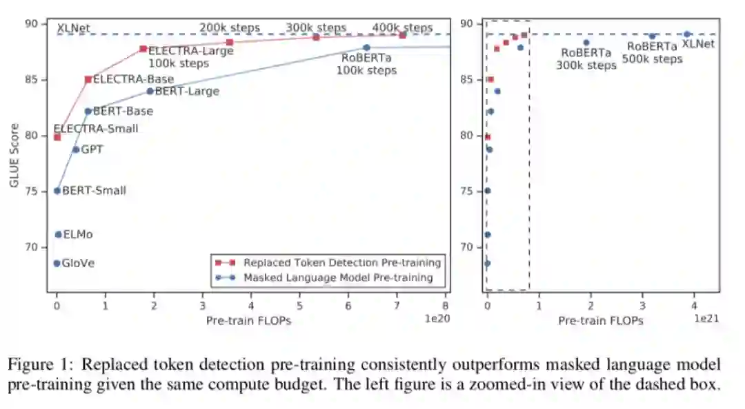 其中心思想十分简单:不是让模型猜测被掩盖的字符,而是需要其区分哪些字符已被一个小的生成网络替换,该生成网络将产生合理但错误的token。作者声称这个任务更具有样本有效性,因为该任务是在整个序列上训练而不仅仅是被掩盖的字符上。如果结果证明它们很容易被复现,那这一方法很可能成为无监督学习的新标准。