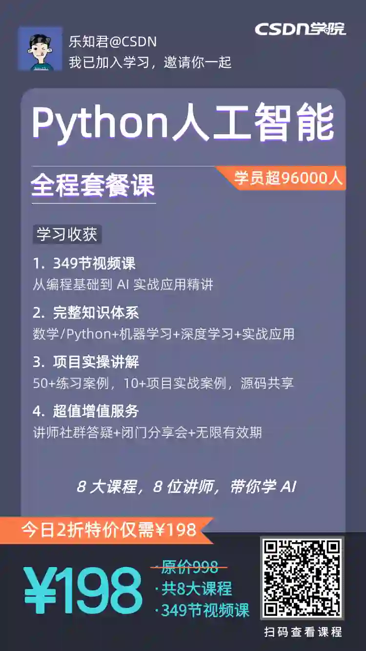 基于这个思路,为了让更多小白从 0 建立挑战人工智能工程师的能力,CSDN联合谷歌人工智能开发专家彭靖田老师以及7位一线AI工程师,共同打造了这门<Python 人工智能全程套餐课>让你 0 基础,通过正确的学习路线,配合大量项目实战,轻松迈向AI工程师!