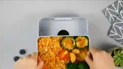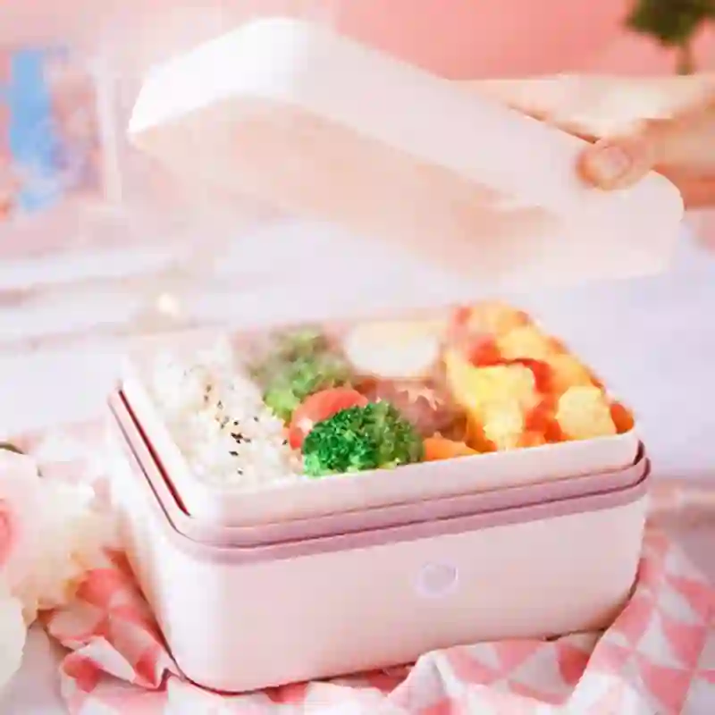 2、放入装好饭菜的内胆盒,打开内盒的盖子,盖好加热盒的盖子,让蒸汽能够充分进入饭菜里面。