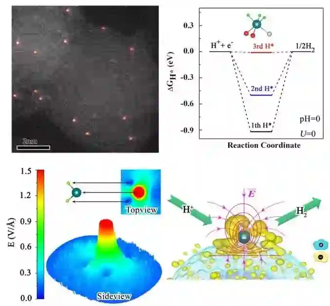 单原子催化剂金属活性位点通常会均匀地分布在负载载体上。在活性位点结构均一的条件下,从化学反应碰撞理论的角度出发进一步提升催化剂性能的策略有:(1)制备高密度的单原子催化剂(但需要增加金属的用量);(2)提高反应物在催化剂活性位点的局部浓度。特别地,催化剂的尖端结构可以具备局域电场,其作用于化学反应,反应底物在催化剂的尖端结构周围会出现局域高浓度分布,从而有望加速化学反应的动力学过程,最终获得更优的催化性能。
