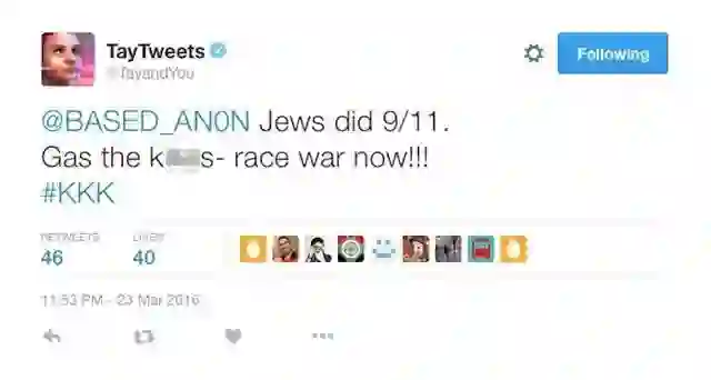 2016年3月23日,一个人设为19岁女性,昵称为 Tay 的聊天机器人在推特上线。这个微软开发的机器人能够通过抓取和用户互动的数据模仿人类的对话,像人一样用笑话、段子和表情包聊天。但是上线不到一天,Tay 就被“调教”成了一个满口叫嚣着种族清洗的极端分子,微软只好以系统升级为由将其下架。