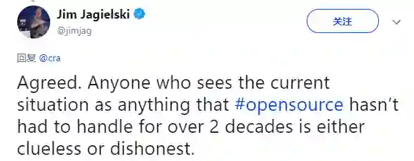 Apache软件基金会的联合创始人Jim Jagielski就在推特上写道:“这种说法不是无知,就是在故意说假话。”他还表示,Apache Web的开发人员一直对能被商业公司“搭便车”感到非常高兴。因为这可以进一步确保面向所有网络用户的公开、公平的竞争环境。