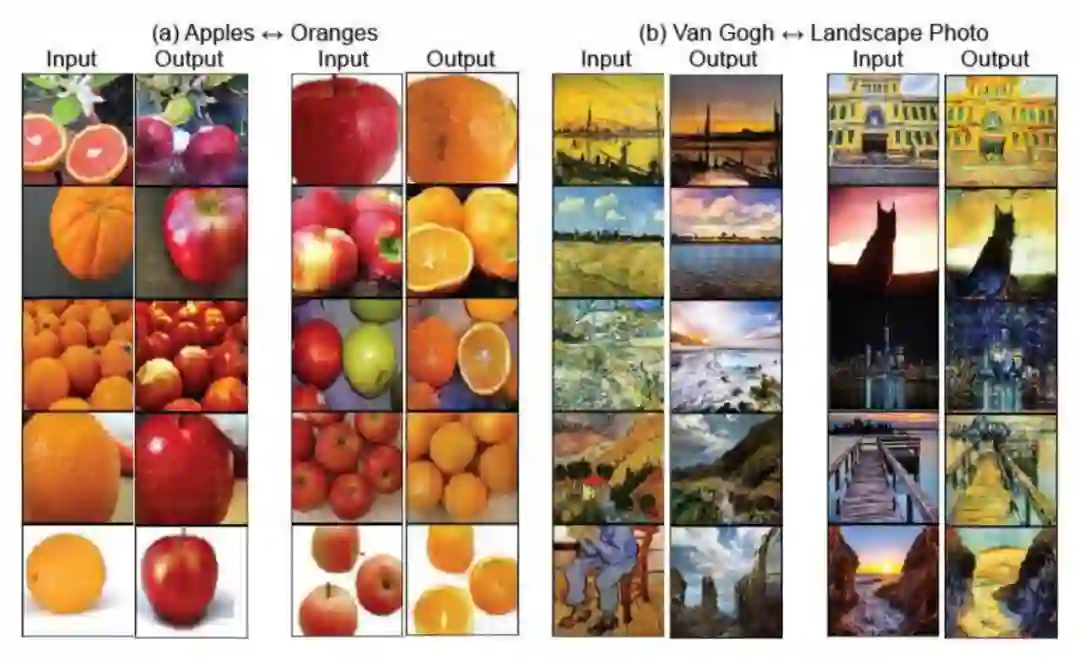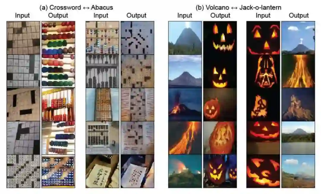 作者主要针对传统图像翻译模型经常采用的 Apples to oranges, Van Gogh to landscape photo, Sketch to shoe 等异构性不大的数据集进行对比实验,另外也选取了 ImageNet 中 abacus, crossword, volcano, jack-o-lantern 等异构性较大的数据集进行实验。