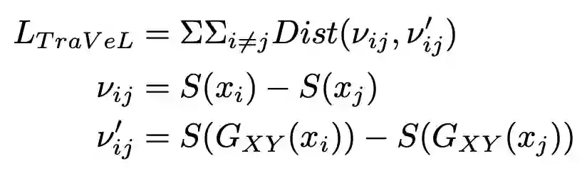 对于 Siamese 网络而言其希望可以保证原域任意图像间的高级语义特征差:与对应翻译后图像间的高级语义特征差保持一致,即: