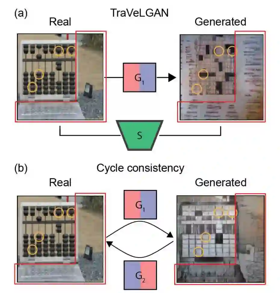 对于强异构性的图像翻译,作者发现加入 Siamese 网络后 TraVeLGAN 可以学习到更高级的语义特征。如图 3 所示,TraVeLGAN 可以将算盘中的黑色珠子映射到填字游戏中的黑/白方块中,而 CycelGAN 仅能学习到将黑色珠子映射为白色方块,即在强异构性的图像翻译中 TraVeLGAN 比 CycelGAN 能产生更合理更多样的输出结果。