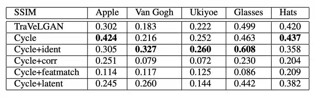 对于相似域间的图像翻译效果的评估,作者使用了 SSIM 结构相似性来衡量,结果如表 1 所示,其中主要的对比实验是 CycleGAN 及其变种,可以看出对于相似域间的图像翻译 TraVeLGAN 可以达到和 CycleGAN 类似的效果,也就是我们完全可以不对生成器进行限制就能达到良好的翻译结果,如图 2 所示。