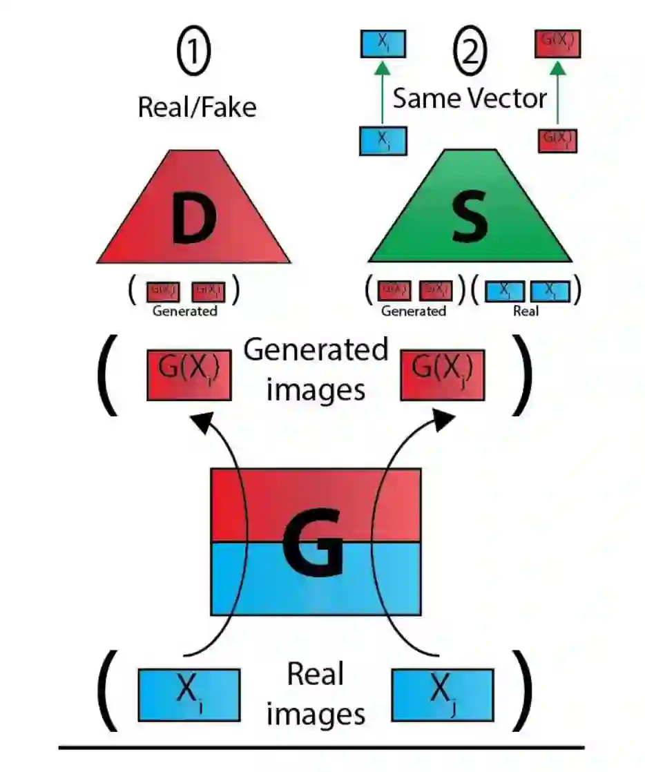 因此作者提出了利用三个网络来进行图像翻译:Generator, Discriminator 以及 Siamese,其中前两个网络主要解决将原域图像翻译至目标域的问题,Siamese 网络用于学习图像高级语义特征从而保证翻译后的图像与原域图像相似。