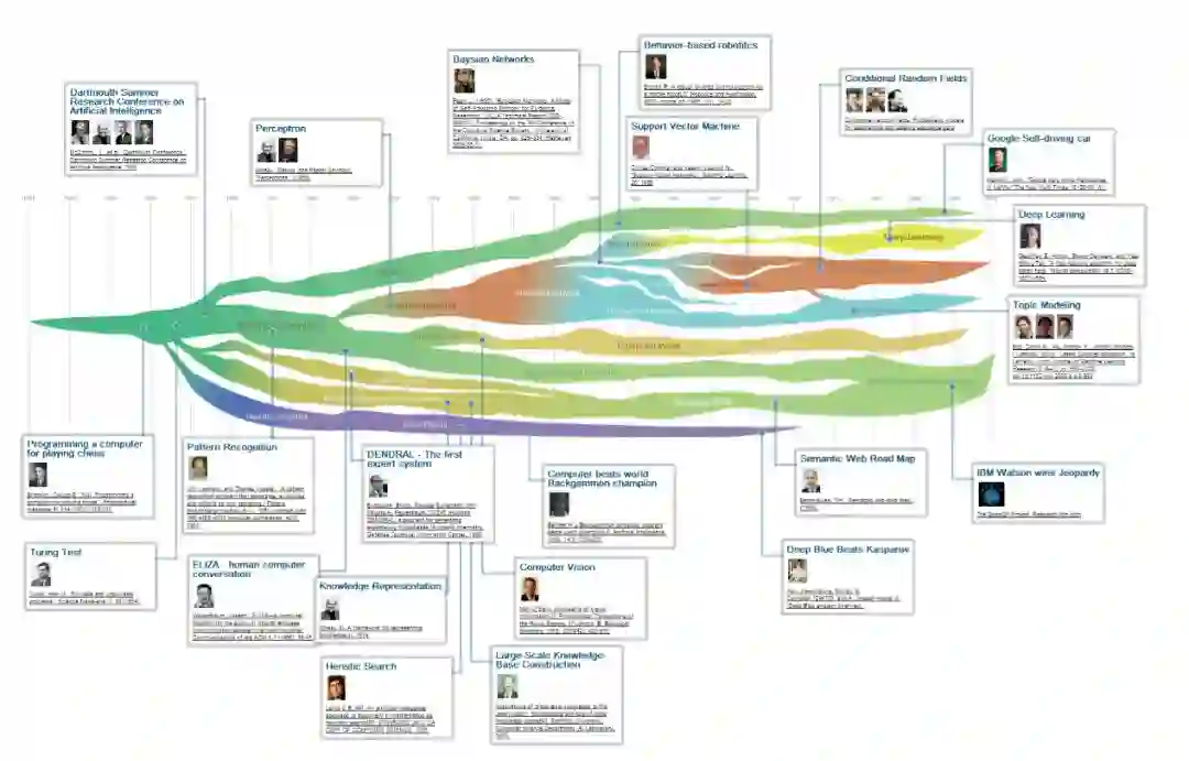 技术发展趋势分析是当前的一个研究热点。项目团队基于AMiner多年积累的数据资源及技术基础,能自动分析挖掘不同技术领域的发展趋势,标出分支技术及技术发展历程中的重要人物及事件(代表论文)。同时支持发现领域技术热点及进行技术前沿分析等知识服务。下图展示了AMiner对人工智能技术的技术发展趋势分析。