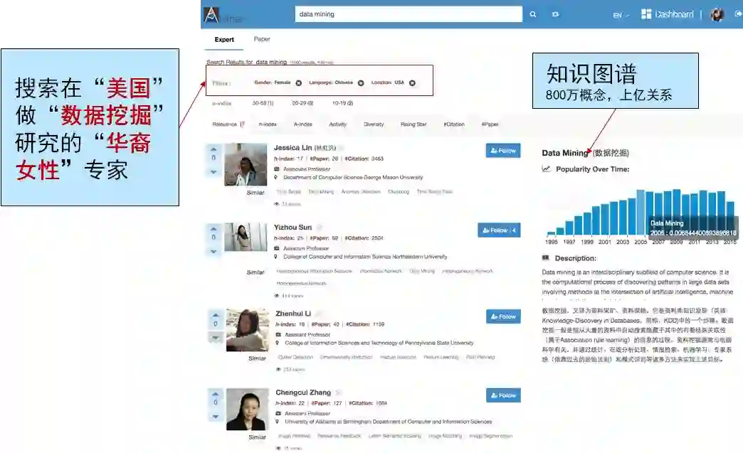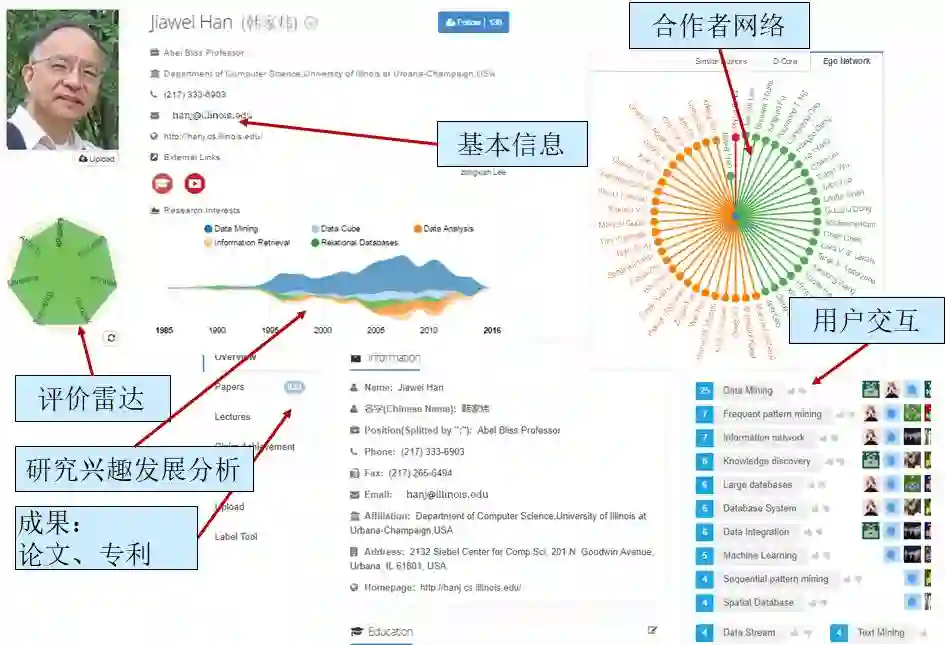 学者画像及分析挖掘是AMiner平台的核心功能服务之一。其特色在于除了提供专家学者如姓名、单位、地址、联系方式、个人简介、教育经历等个人基本信息之外,还利用团队多年的命名排岐相关技术基础,建立了较为完全的学者-论文映射关系,提供学者学术评价、研究兴趣发展趋势分析、学者合作者关系网络等分析挖掘信息,同时支持用户交互,通过众包方式丰富专家学者的相关信息。学者档案信息对公众开放,注册用户可免费查询专家档案信息。