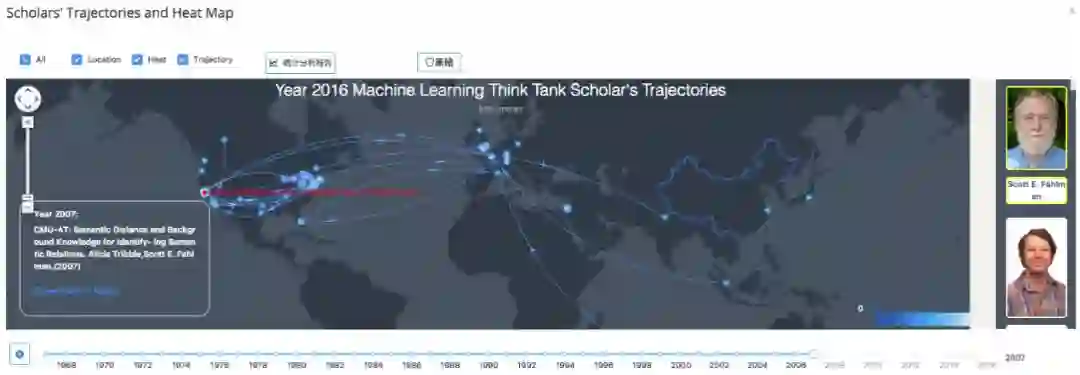 全球学者迁徙图直观的展示特定技术领域专家学者在全球随时间的分布变化情况,可以快速定位不同历史时期的技术研究热点地区及代表性专家。同时也支持对特定专家的迁徙情况进行专门分析展示,以及某特定时期内全球热点区域的统计分析等。下图展示了2016年“机器学习”领域全球最有影响力学者在2007年的迁徙图。