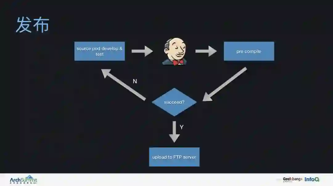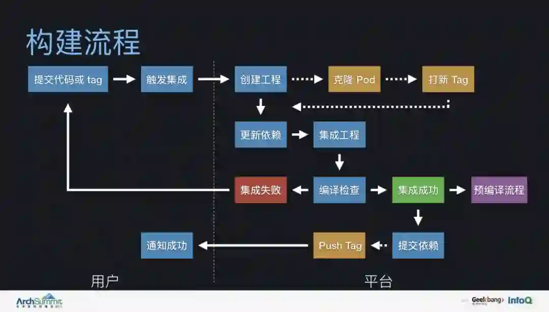 任何一个开发者提交了代码之后,会触发集成、创建工程、克隆 pod、打新 tag、更新依赖、集成工程、编译、集成失败,会修改,如果成功: