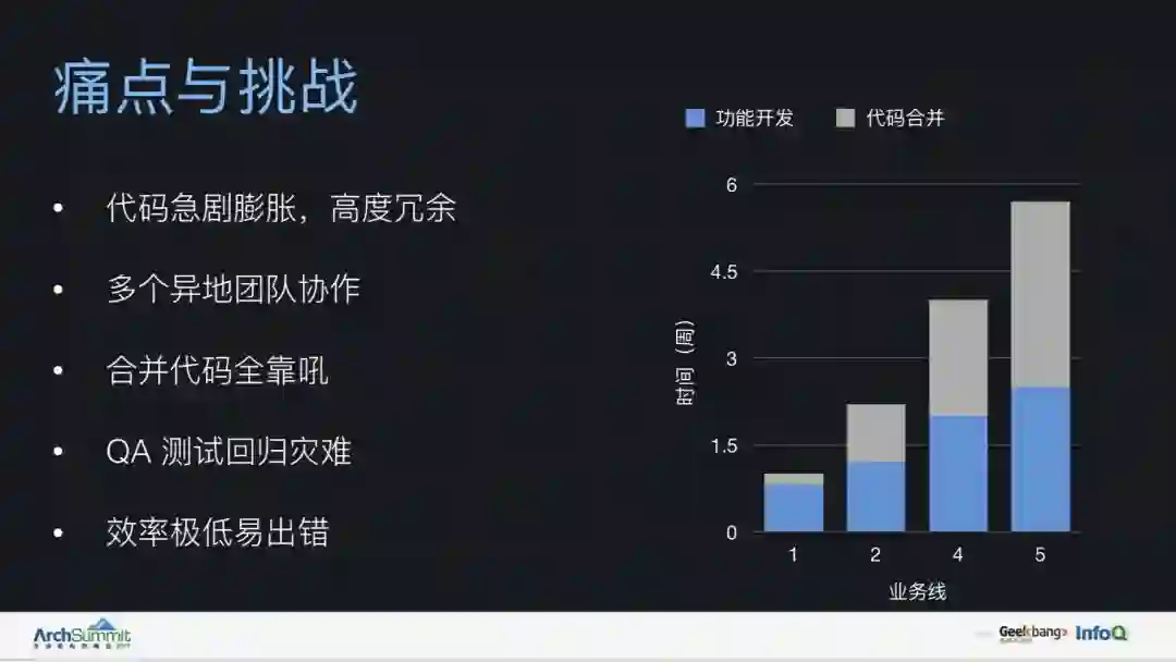 在 4.0 版本,我们遇到了很多挑战和痛点,这个阶段被定义为平台化整合阶段,由于在这个时期竞争对手的出现导致应用需求需很快上线。时间短、业务重,快速上线造成了工程代码极度膨胀,高度冗余。在这个时间段滴滴出行和快的打车又进行了合并,开发者出现跨地域分布,因此跨地域的团队协作,资源分散在各地,团队间沟通和交流都出现了很大的问题。