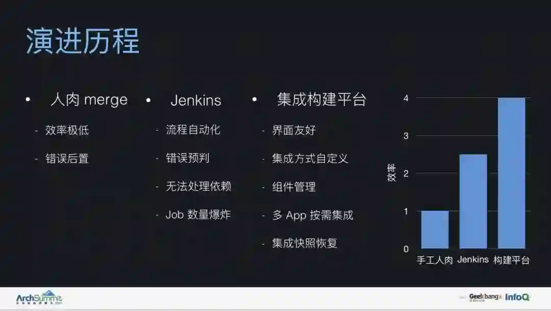 另外集成构建平台相比 Jenkins 会增加一个统一管理所有组件的功能,借助这个功能,在基础平台上通过不同的组件的集成就会包装出不同的 APP,即支持多 APP 的集成,集成构建平台还有一个功能就是会对每次集成构建创建快照,根据需要的时候能进行恢复,如果一个历史线上的包出现问题的话,可以快速恢复那个包的代码状态,进行调试,集成构建平台的投入使用是人肉手工效率的 3 倍左右。