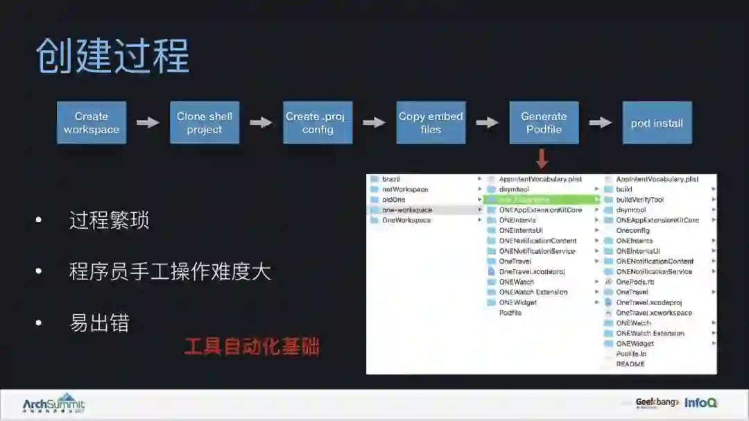 然后我们对构建系统进行了再次升级,推出了 OneTool 工具,标准化壳工程改造,是我们的壳工程经历了合久必分,分久必合的过程,以及基于 Cocoapods 的预编译优化。