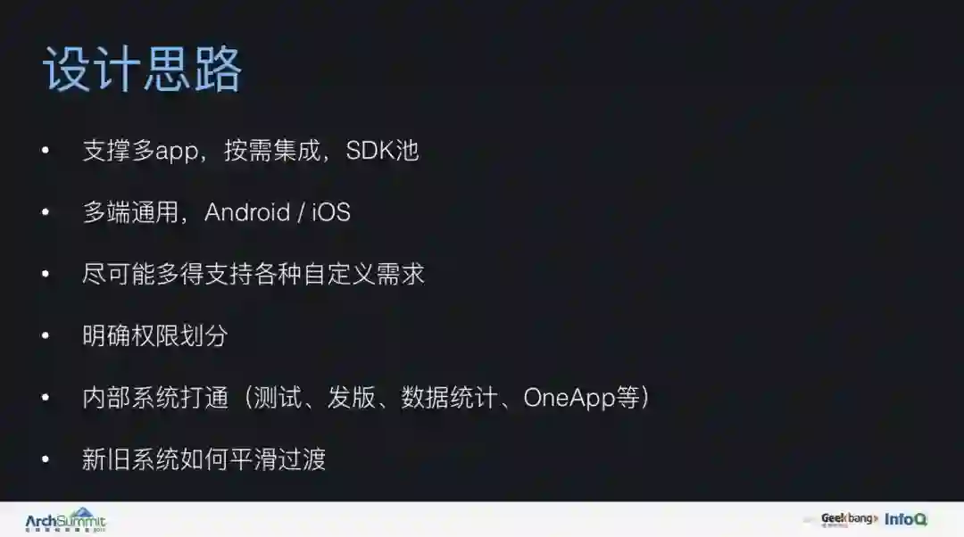 我们集成构建平台的设计思路,主要是为了解决 Jenkins 的一些问题才推出的,首先它支持各种自定义的需求,以及要支撑多 APP 的集成,还要统一管理公司内部所有的 SDK,不能只针对 iOS 一个端使用,一定要多端通用。最后集成构建平台的各个用户权限一定要有明确的划分。