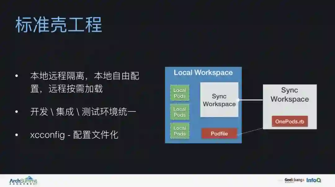 上图是标准壳工程的大概模型图,可以看到它分为两部分:一是本地的部分,这一部分开发者可以进行自由改造,还有一部分是同步的 Workspace,这是不允许开发者进行修改的。