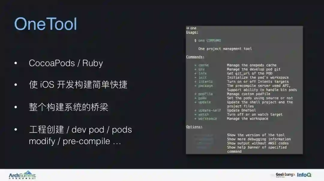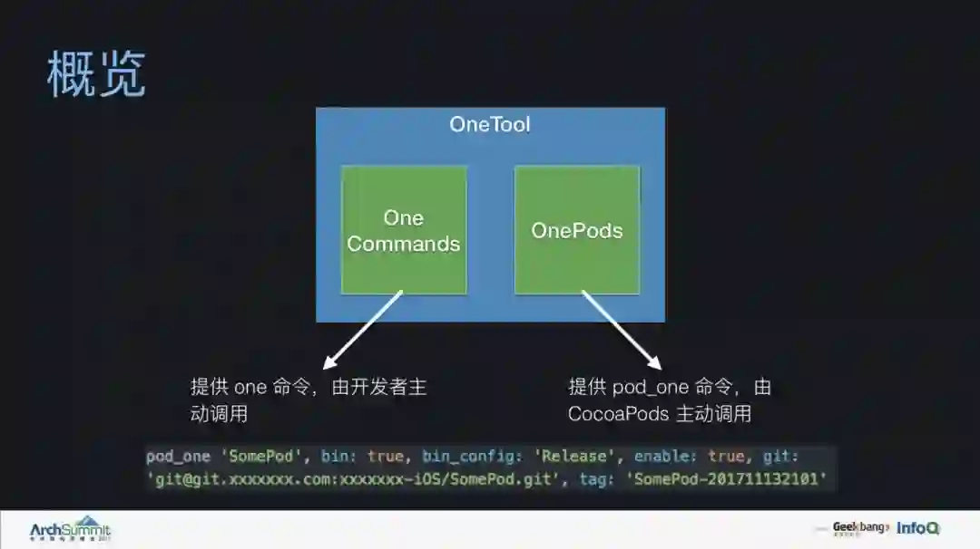 OneTool 包括两个部分,第一部分是 One Commands,这是由开发者主动调用的。还有另外一个部分是 OnePods,它是由 Cocoapods 主动调用的。