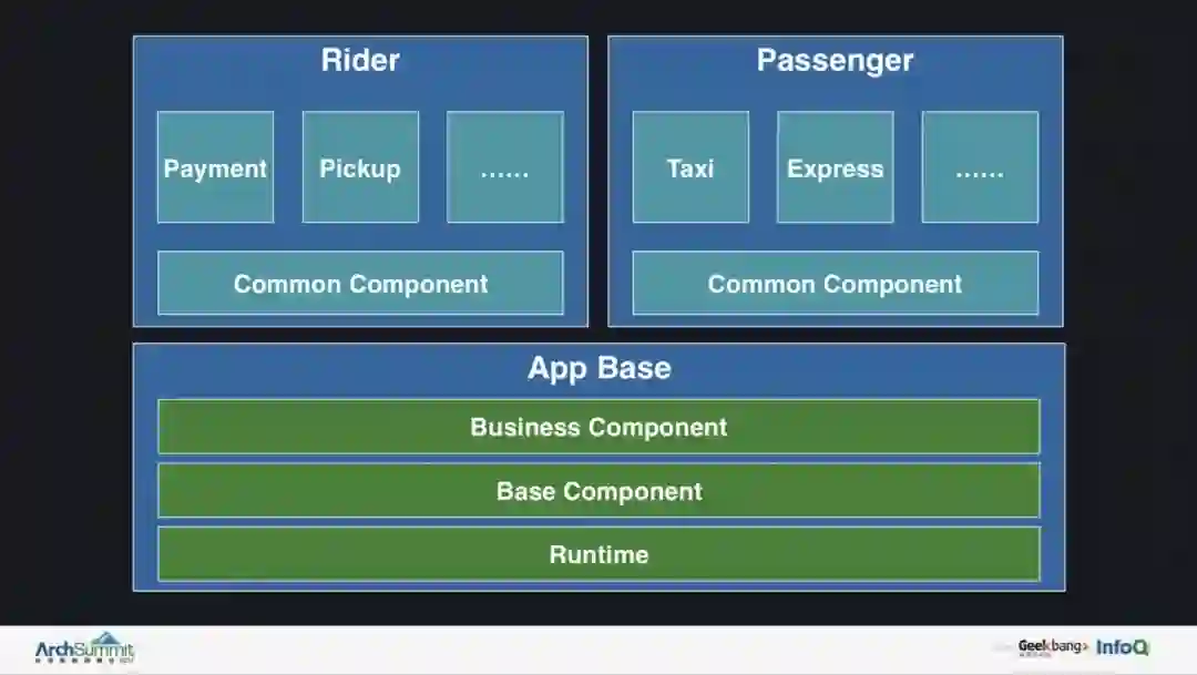 这个是我们目前的基本架构图,大家可以看到下面是基础平台的部分,包括了一些通用的运行时组件,一些基础组件还有业务组件,在平台之上会有不同的 APP,每个不同的 APP 加入自己的个性化组件,包装成一个 APP。