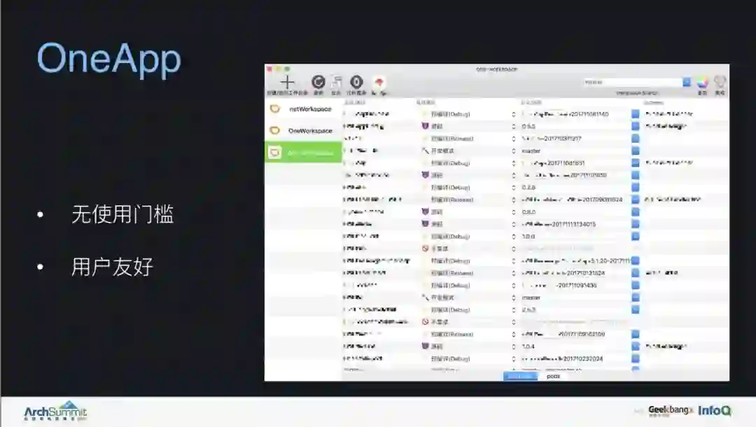 所以,我们基于 OneTool 开发了一个 GUI 工具,就是 OneApp,它把所有 OneTool 的命令都集中到这个界面上,降低了使用门槛。OneApp 除了基本功能以外还提供了对所有的 Workspace 统一管理的功能,图中左侧展示出了所有的 Workspace,右面的主要区域是展示选则的 Workspace 的 Pods 的基本情况,它可以对任何一个 pod 进行任何信息的修改。